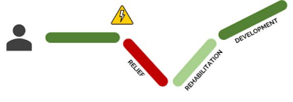 Het figuur hiernaast laat zien dat er 3 mogelijke antwoorden zijn op het probleem van armoede. De eerste is relief (noodhulp): de urgente en tijdelijke noodhulp, om direct lijden als gevolg van een crisis, of die nu natuurlijk is of veroorzaakt door mensen. Hier vallen de uitdeelacties onder. De noodhulp is bedoeld om een vrije val te voorkomen, om het bloeden te stelpen. Het fijne van noodhulp is dat de resultaten goed meetbaar en direct zichtbaar zijn: we hebben 5 huizen gebouwd, 3 scholen, er zijn 20 gezinnen geholpen met voedselpakketten. Maar hoewel noodzakelijk in noodsituaties, is noodhulp schadelijk voor de waardigheid van de mens. Het zorgt ervoor dat de situatie in eerste instantie slechter wordt. Het doet geen beroep op de zelfredzaamheid van het individu, maar schakelt dat uit. Want alles wordt voor degene die de hulp ontvangt, gedaan. Daarmee wordt ook het zelfvertrouwen en de zelfwaardering van het individu geweld aangedaan. Sleutelwoorden voor relief zijn zelden, direct, en tijdelijk. Het moet spaarzaam worden gedaan, alleen op het moment van acute crisis om erger te voorkomen, en er moet een einddatum aan vast zitten.Rehabilitation