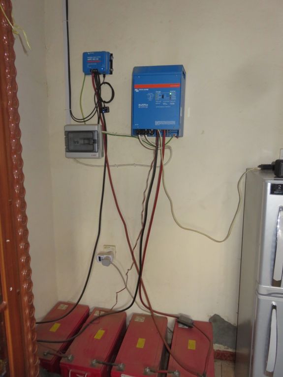 Een grappige anekdote in het kader van stroom is hoe we erachter kwamen dat de buren onze stroom aftapten. Op een avond gaf onze inverter “low battery” aan. Heel raar, want er was best wel wat zon geweest. Het was alsof er ergens heel veel stroom weglekte. Een voor een zetten we de stoppen om, om te kijken op welke groep het zat: de groep van de buitenverlichting. Maar we konden niks raars vinden bij onze buitenverlichting. Tot Mark op het idee kwam om eens over de muur te kijken. Een van ons zette de stop uit en na vijf tellen weer aan en de ander keek op een ladder naar het huis van de buren. En ja hoor: het licht van de buren ging uit en na vijf tellen weer aan! Betrapt. Voor straf zetten we de stop van de buitenverlichting die avond uit. En de volgende ochtend toog Mark naar de buren. Geheel tegen de verwachting in werd hij hartelijk ontvangen en werden er veel excuses gemaakt. We hebben ze inmiddels een 1 Ampère-stop gegeven, zodat ze ’s avonds wel licht hebben voor hun studerende kinderen, maar niet meer met een strijkijzer onze batterijen kunnen leegtrekken.